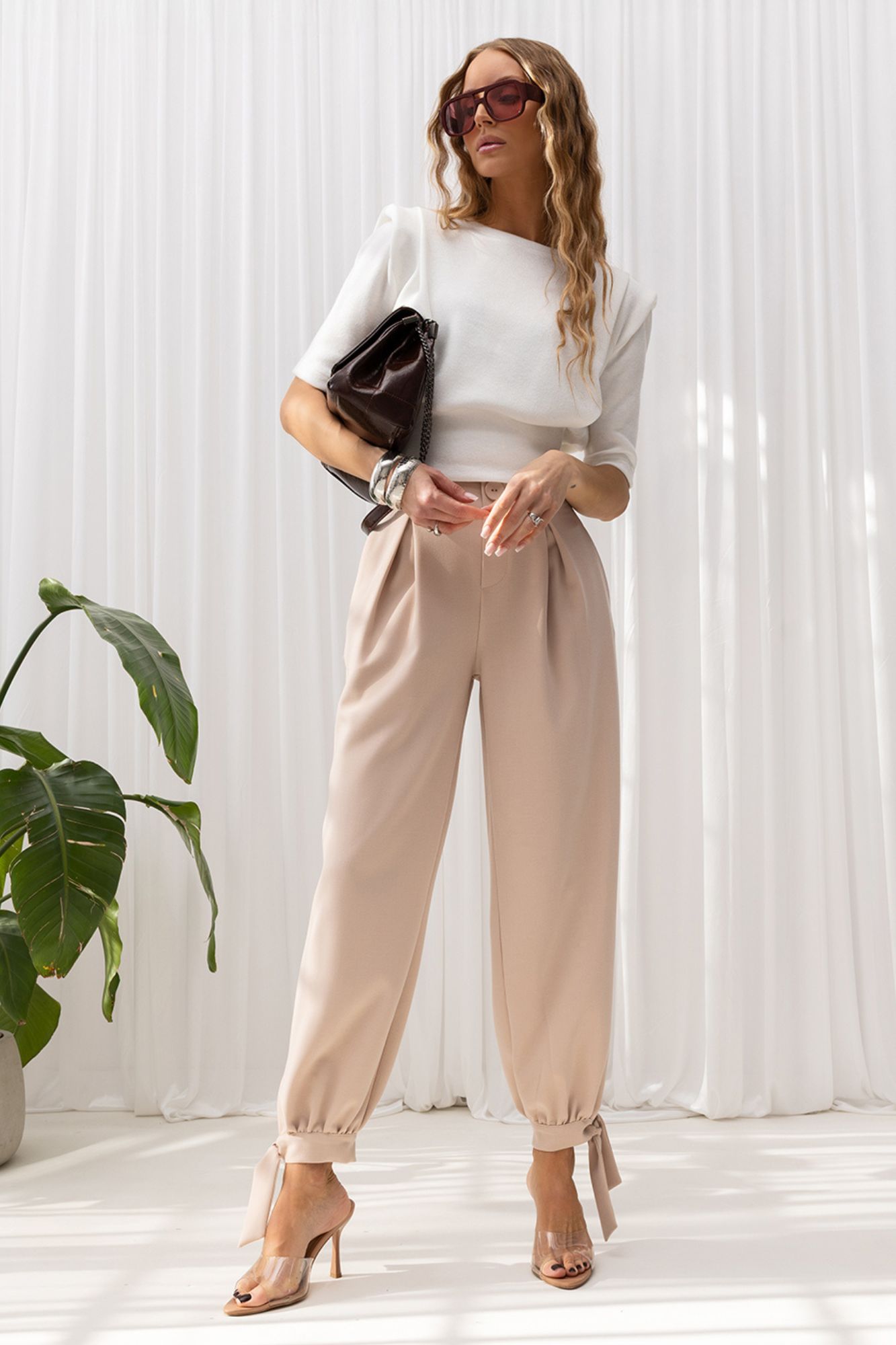 Eleganckie spodnie damski Gaya z zakładkami i kokardką beżowe