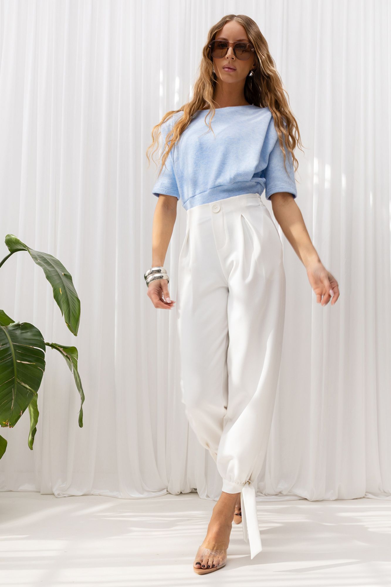 Eleganckie spodnie damski Gaya z zakładkami i kokardką białe