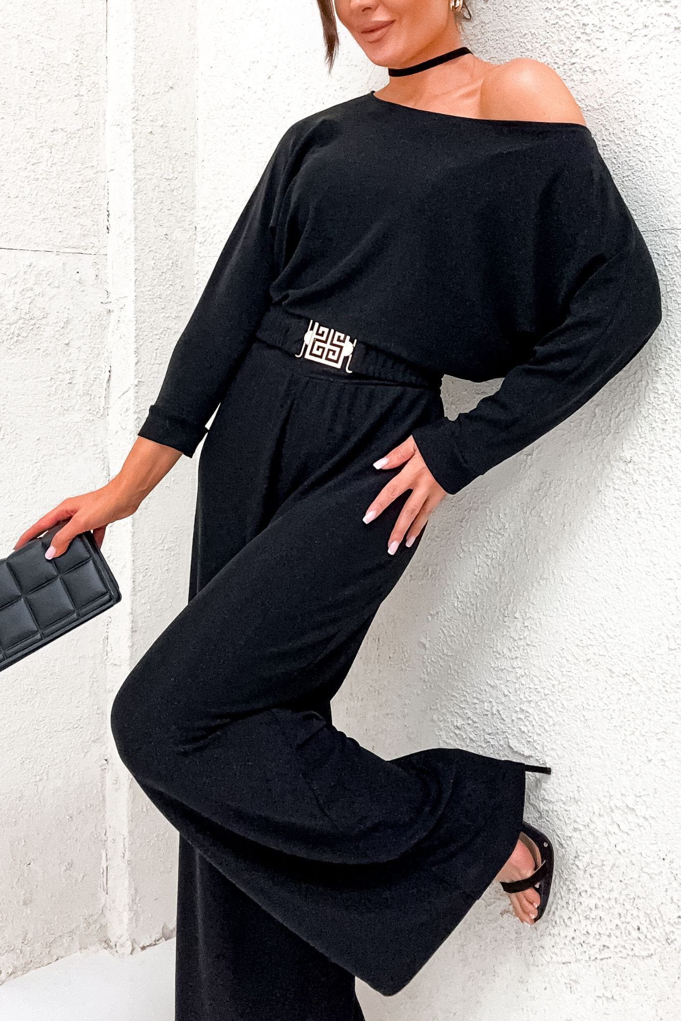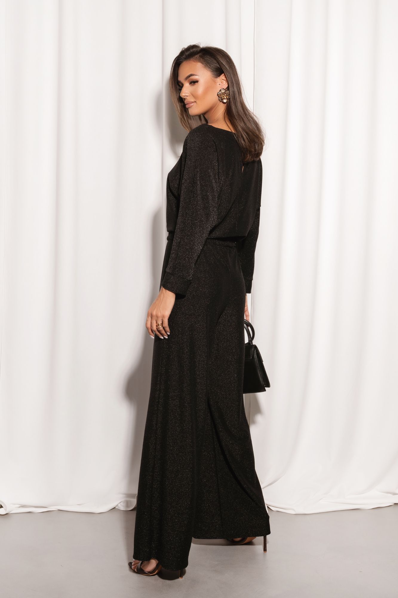 Czarny kombinezon Party o subtelnej poświacie pokazuje, że można wyglądać urokliwie i elegancko nawet w spodniach. Góra tego kombinezonu delikatnie opada, pozwalając na zamaskowanie ewentualnych niedoskonałości figury. Rozszerzone nogawki to obecny modowy trend. Elastyczna gumka w pasie oraz dodatkowy pasek podkreślają kobiece kształty, nadając wyjątkowy urok całej stylizacji.