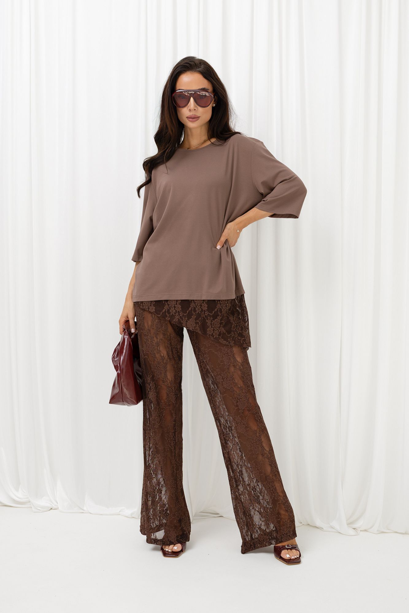 Brązowe koronkowe spodnie to mocny, stylowy akcent w garderobie. Zmysłowe, kobiece i niezwykle efektowne – idealne, gdy chcesz połączyć elegancję z modową świeżością.